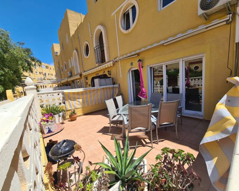 The property boasts the most amazing panoramic views of the Mediterranean Sea and the mountains from its private roof terrace of 15m2. As you enter the property you are greeted by a patio garden area which catches the afternoon sunshine and over views the communal gardens close to the swimming pool, inside the townhouse on the ground floor you have access to an open plan lounge / dining area and an American kitchen. On the center floor of the property you have two twin bedrooms with access to a family bathroom and on the upper floor is where the master bedroom is situated with access to an en-suite bathroom. Step onside onto the balcony and you have steps leading up to the roof terrace where you can sit with a cocktail or two and take in the beautiful scenery.