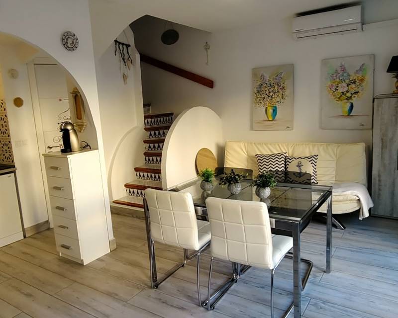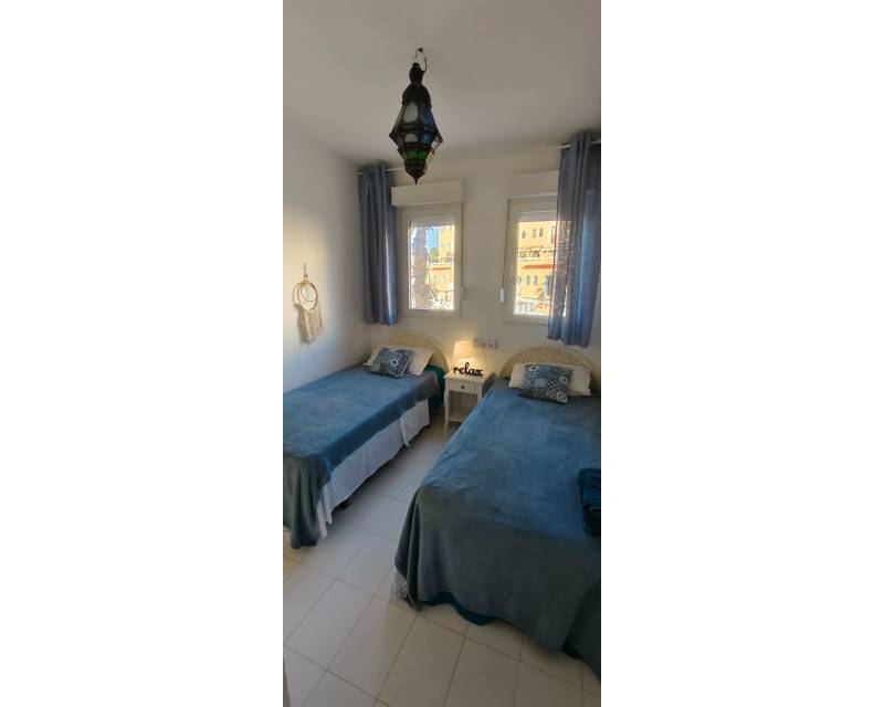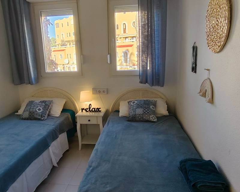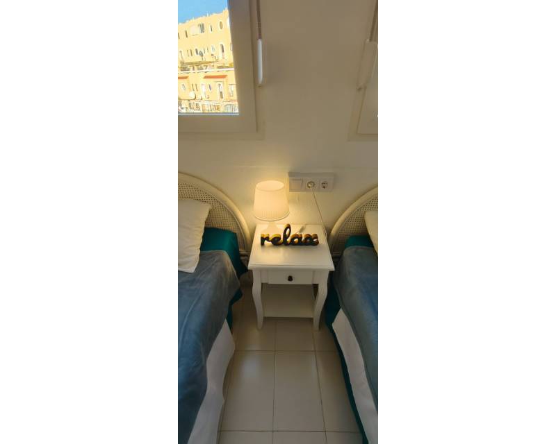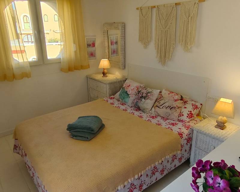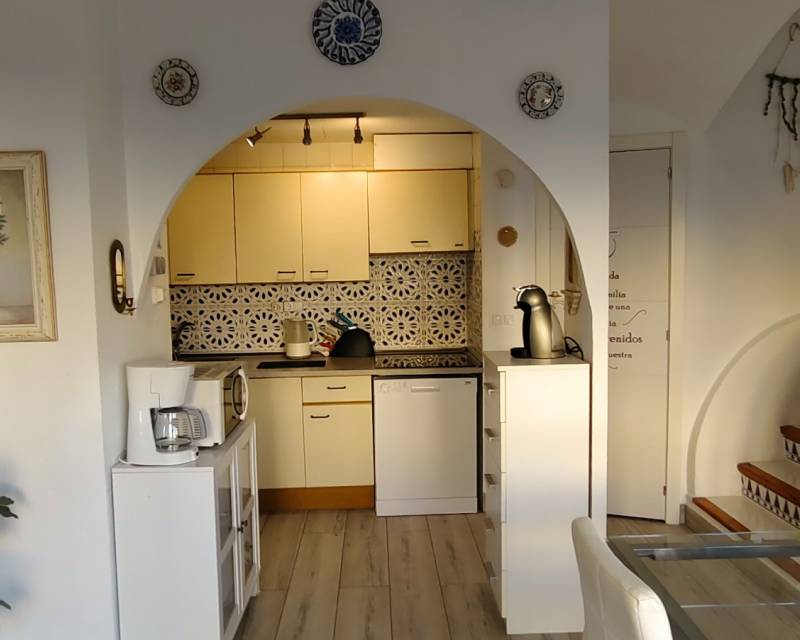 The property boasts the most amazing panoramic views of the Mediterranean Sea and the mountains from its private roof terrace of 15m2. As you enter the property which has new windows and doors you are greeted by a patio garden area which catches the afternoon sunshine and over views the communal swimming pool and gardens, as we step inside the townhouse on the tastefully decorated ground floor you have access to an open plan lounge / dining area and a American style kitchen. On the central floor of the property you have two twin bedrooms with access to a family bathroom and on the upper floor is where the master bedroom is situated with access to an en-suite bathroom and with easy access to step onside onto the balcony and you have steps leading up to the roof terrace where you can sit with a cocktail or two and take in the beautiful scenery. Please note that the property offers you cold and hot air conditioning throughout the property. Step outside of the gated community and you can access the relaxing pebbled beach of L´ Amerador which is a perfect spot fr soaking up the sunshine or taking a cooling down refreshing dip in the sea.