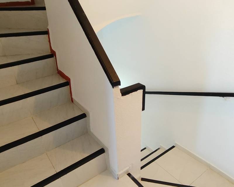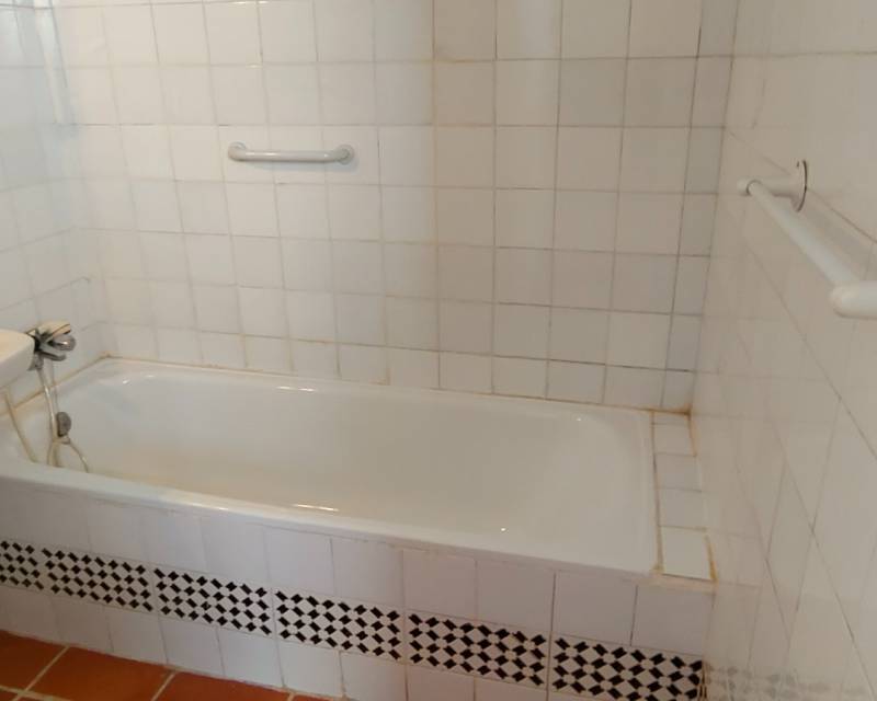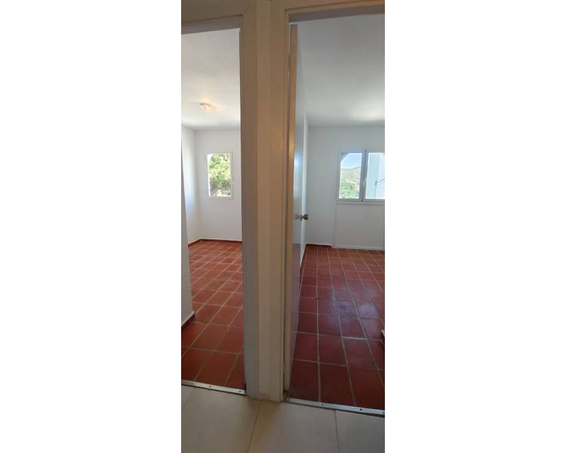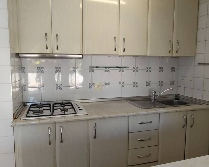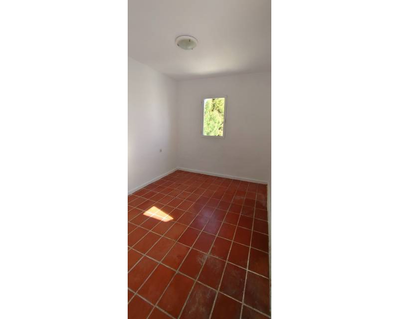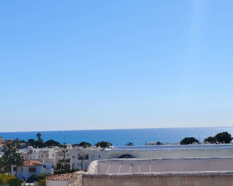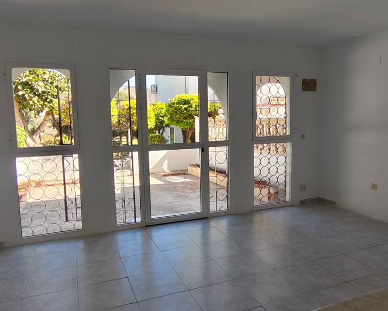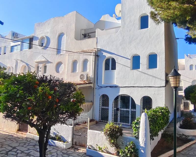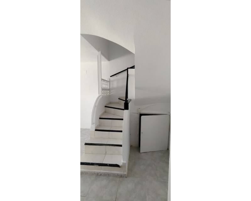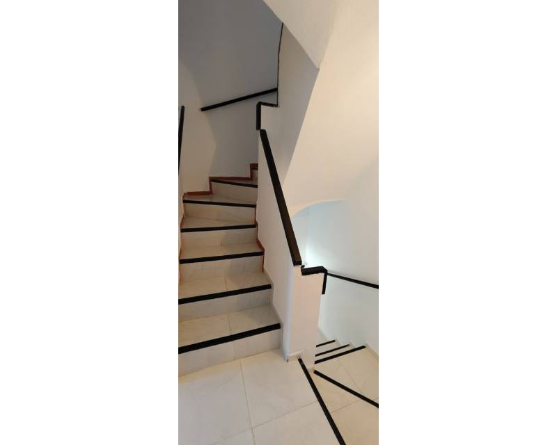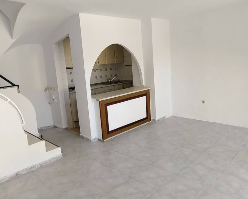 This end of terrace property located on the outer edge of the urbanisation of Alkabir, El Campello Alicante sits within a peaceful area surrounded by greenery and offering you distant views of the sea and mountains the upper terrace. The plot over views the communal gardens and is situated within a short stroll of the local tavernas. The patio offers you morning sunlight and the private roof terrace offers sunlight throughout the day time. As we enter the property you are greeted to an open plan lounge, dining area and American style kitchen, guiding you onto the first floor you are offered the choice of 2 twin bedrooms with fitted wardrobes and offer access to a family bathroom with shower. The upper floor level houses the master bedroom with adjoining en-suite bathroom along with access to a balcony with stairs leading to the solarium where you can take in the views. The townhouse as recently been re painted and is in its original format.